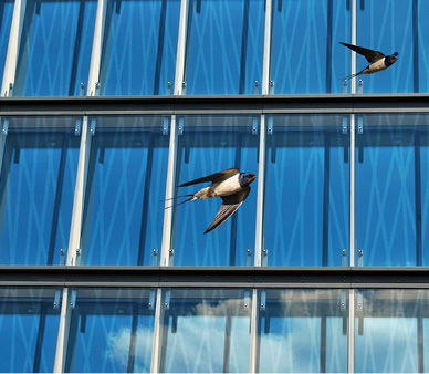 Research on bird-glazing collision prevention has guided the development of bird-friendly architectural glass and building design, transforming clear and reflective glass into barriers that birds will see and avoid. Particularly important in urban areas or regions with high bird populations, bird-friendly glass employs various strategies to make the glass more visible to birds, including patterned or frosted glass, acid-etched glass, UV-reflective coatings, and films or coatings.