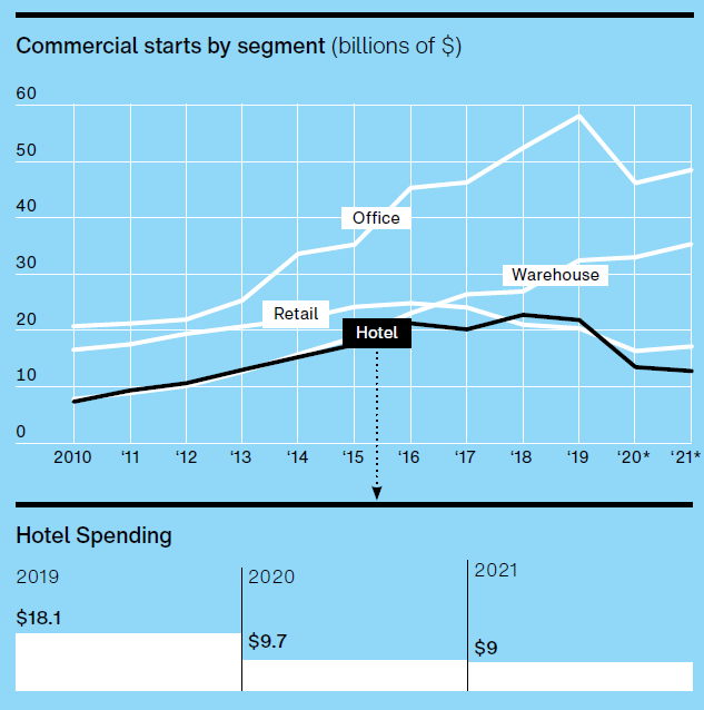The hotel market took the greatest hit among commercial building segments in 2020, dropping 46 percent from $18.1 billion in 2019 to $9.7 billion in 2020. The segment won’t fare much better in 2021, with an additional 7 percent decline projected.