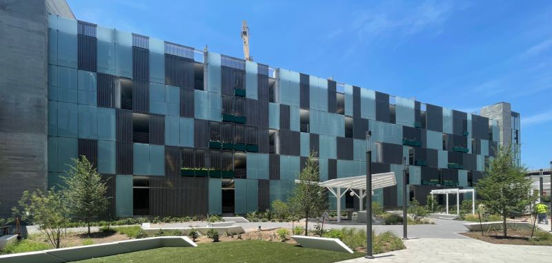 The parking façade is cantilevered with custom fiberglass planters and wood that will age over time, turning grey as the vines take over the face of the building. The eight-story parking facility has two levels of parking underground and can accommodate almost 1,000 vehicles.